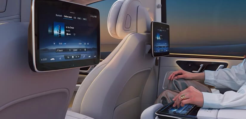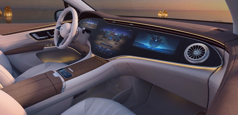 Um destaque inconfundível é o sofisticado interior das lanternas traseiras de LED: os elementos luminosos apresentam o formato de uma hélice arqueada em 3D. Em combinação com a faixa luminosa que abrange a largura total do veículo, a assinatura luminosa característica do Mercedes-Benz revela sua potência radiante.